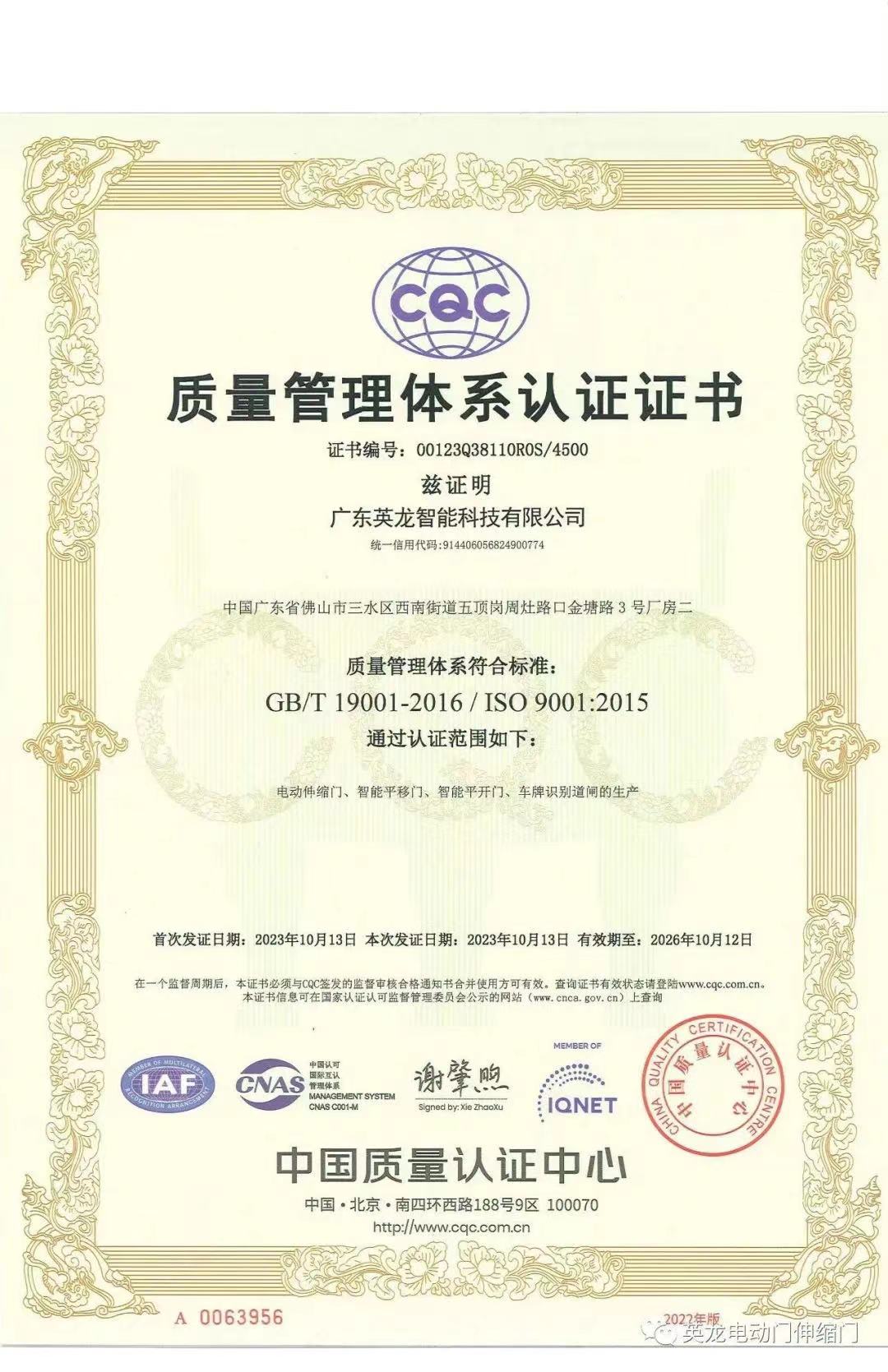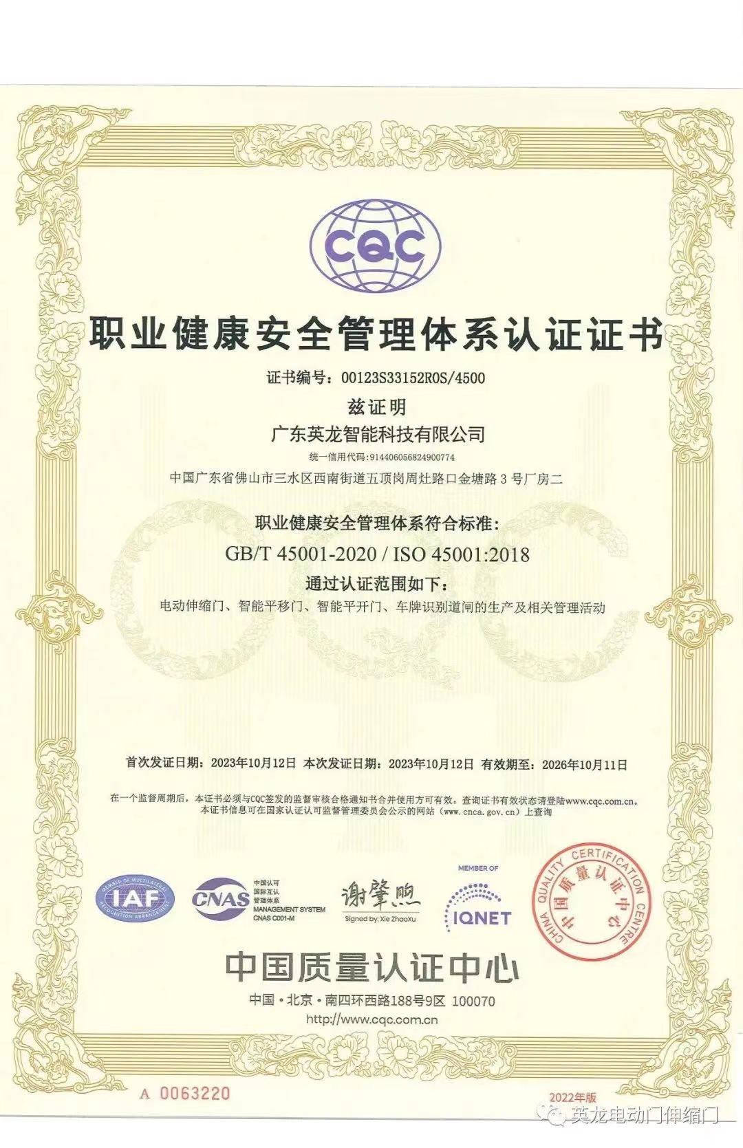 廣東英龍公司榮獲CQC三體系認(rèn)證